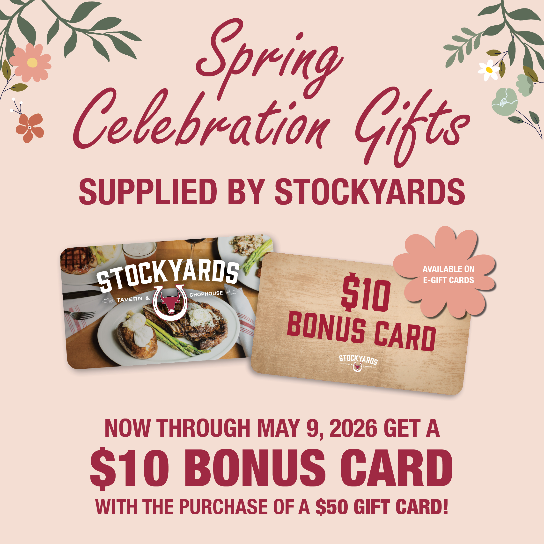 *Bonus cards hold no cash value, nor will credit be applied for any balances. Not valid with other offers or promotions. Stockyards Tavern & Chophouse and Morrissey Hospitality are not responsible for lost or stolen cards. Valid for purchases now through October 31, 2026.